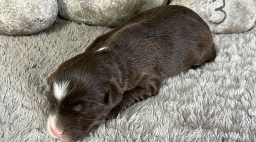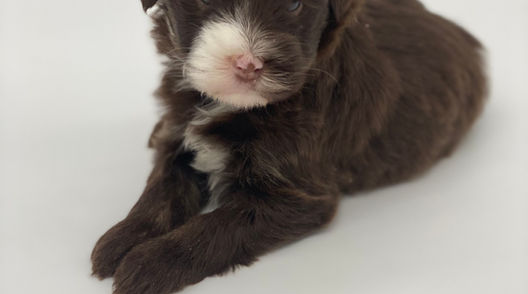 Female 3 is a multigenerational Mini Sheepadoodle, approximately 60% Poodle and 40% Old English Sheepdog. She will mature to be 15 lbs and have a wavy coat. Based on the parents, you can expect her to be really sweet, affectionate, and great with kids.