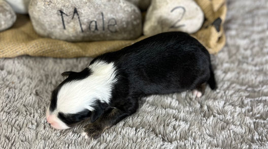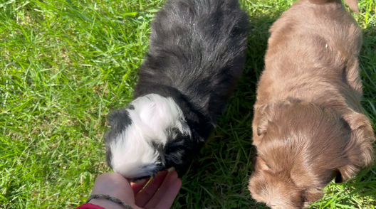 Male 2 is a multigenerational Mini Sheepadoodle, approximately 60% Poodle and 40% Old English Sheepdog. He will mature to be 15-20 lbs and have a wavy coat. He is very sweet, affectionate and calm. His serene yet friendly personality will make him a good for families with kids.